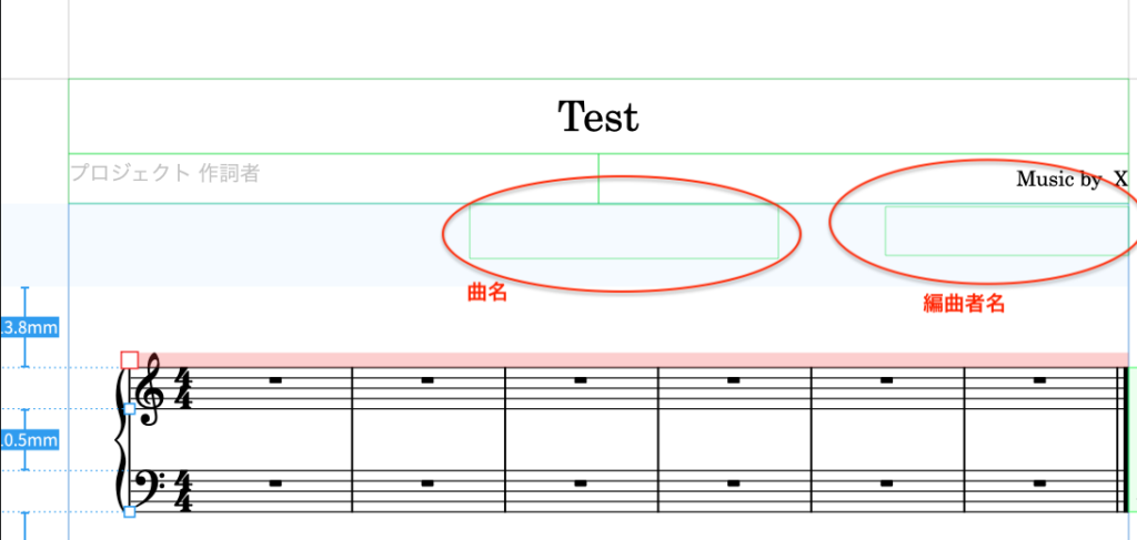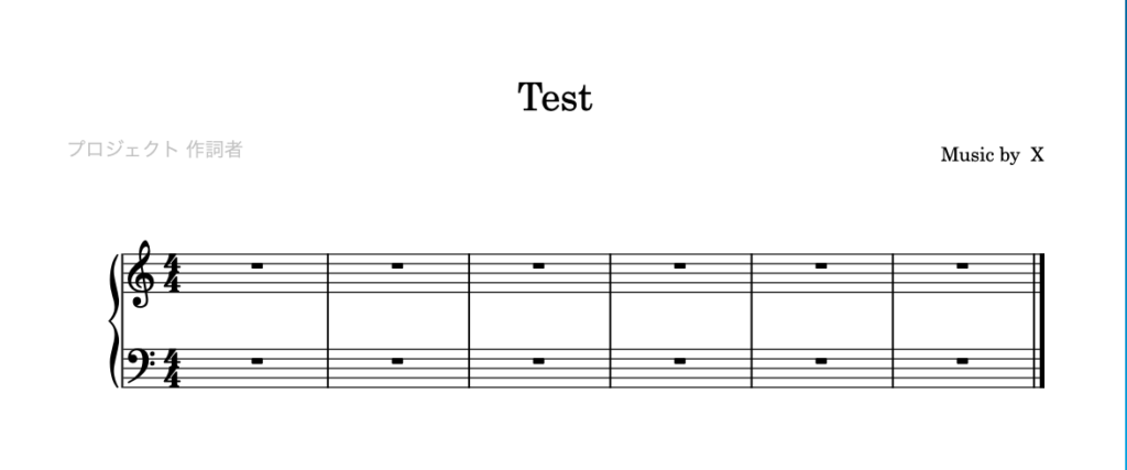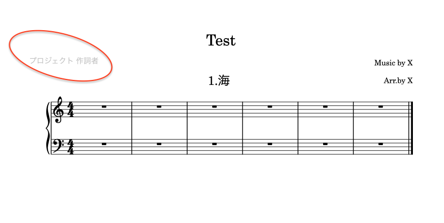 記譜画面を開いてみましょう。次のようになっています。先ほど入力した編曲者名やフロータイトルが現れていないことに加え、プロジェクト作詞者と薄い影があります。これらを修正しましょう。