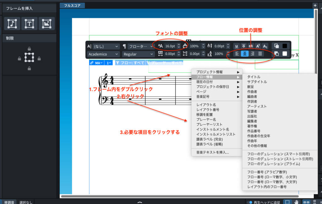 フレームの中央にフロー名(曲名)と右側に編曲者名が現れるようにします。