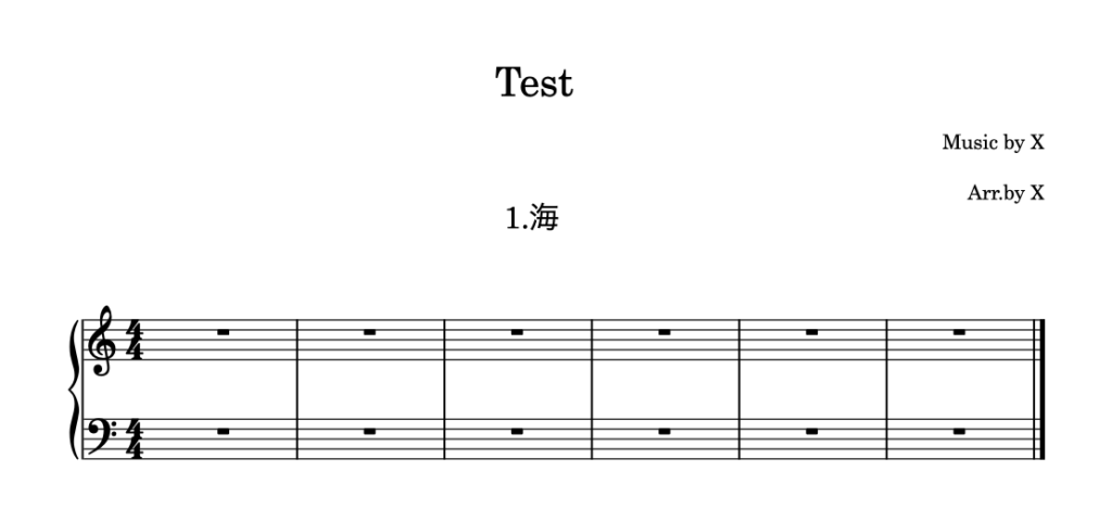 動画では空白のページに、大きめのフォントで曲タイトルと作曲者を打ち込んでいます。全てはこの方法の応用です。