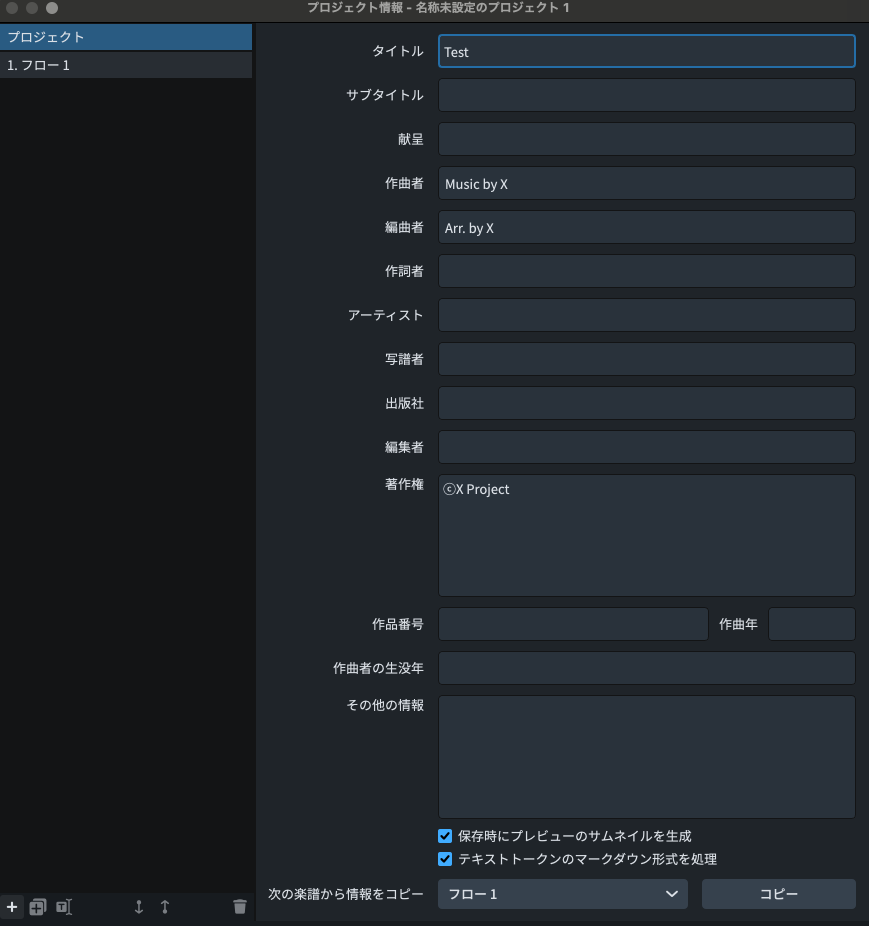プロジェクト情報に、作詞、作曲、編曲など楽曲データを書き込みます。必要であれば、フローも入力します。