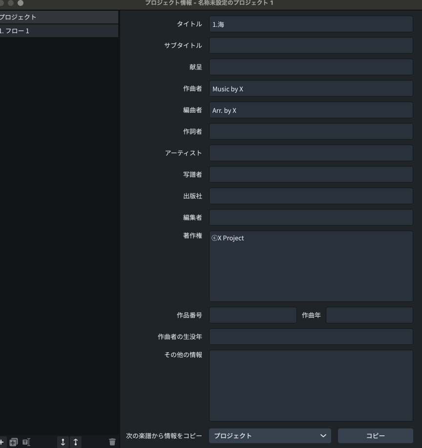 編曲者名、フロータイトルが入りました。残りは左上の「プロジェクト作詞者」を消去するのみとなりました。