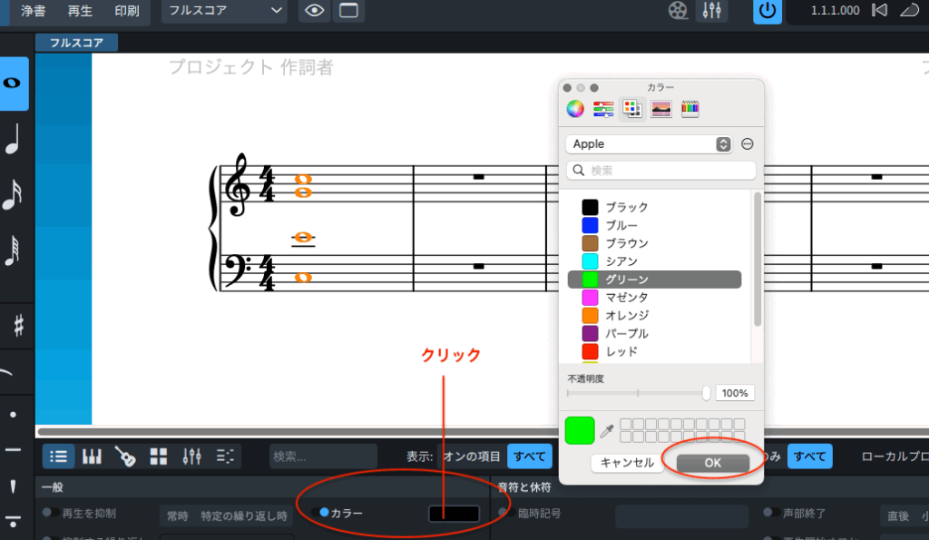 - 色づけする音符を選択し、下ゾーンを開けます。