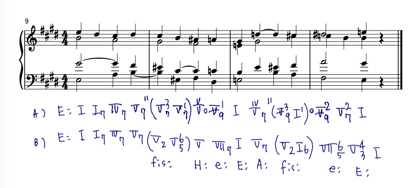 和音記号A)は芸大和声の表記、B)は楽典 理論と実習の表記(数字付き低音)です。