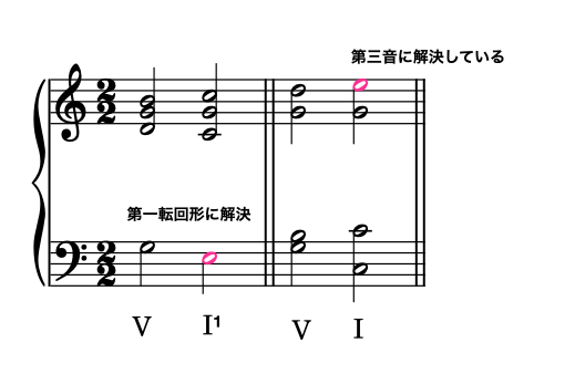 2小節目、属7の第7音の処理ができません。本来なら2度下に進ませたいのですが、そうなれば、次のI度と連続8度になりますし、7音2度下行とバスが3度下がるという最悪の同時進行ができてしまいます。